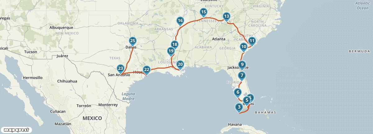 Een afwisselende autoreis door het 'Diepe Zuiden' van de Verenigde Staten. Je start aan de zonnige kust van Florida en bezoekt onder andere de Everglades en Key West. Na genoten te hebben van de rust in de Great Smoky Mountains bezoek je de muzieksteden Nashville en Memphis. Onderweg naar de multiculturele stad New Orleans zie je prachtige oude plantagehuizen. De reis eindigt in Dallas in Texas. Deze reis laat je relatief veel zien in weinig tijd. Rustiger aandoen? Pas de route dan naar wens aan.