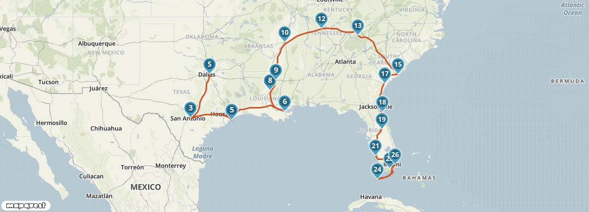 Een afwisselende autoreis door het Diepe Zuiden van de Verenigde Staten. Je start in Dallas in Texas en via de multiculturele stad New Orleans reis je naar de zonnige kust van Florida. Onderweg zie je de hoogtepunten van de Deep South, van oude plantagehuizen tot de muzieksteden Memphis en Nashville. Tussendoor kun je genieten van de natuur in het Great Smoky Mountains National Park. In Florida staan onder andere Orlando, de Everglades én Key West op het programma. Deze route is voor de reiziger die veel wil van de regio wil zien in relatief korte tijd. Uiteraard kan de route helemaal naar wens worden aangepast.