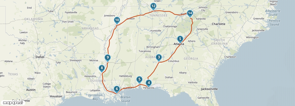 Per auto reis je door het Diepe Zuiden van de Verenigde Staten. Je bezoekt de muzieksteden Nashville, Memphis en New Orleans en historische plaatsen als Natchez en Montgomery. Neem zeker een kijkje bij de prachtige plantagehuizen, bijvoorbeeld op de Boone Hall Plantation.