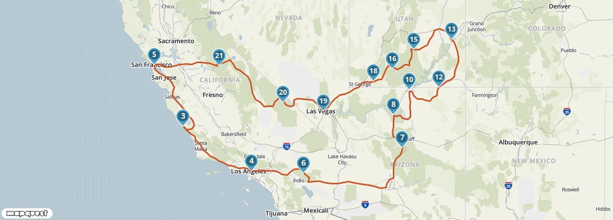 Vanuit San Francisco maak je een rondreis langs de mooiste plaatsen van het zuidwesten van de Verenigde Staten. Je ziet de watervallen van Yosemite, de woestijnen van Nevada en Utah, de indianenreservaten van Arizona en de steden aan de Pacific Coast. Je verblijft op een aantal plaatsen twee nachten, dus je hebt voldoende tijd om alles goed te bekijken en te beleven.