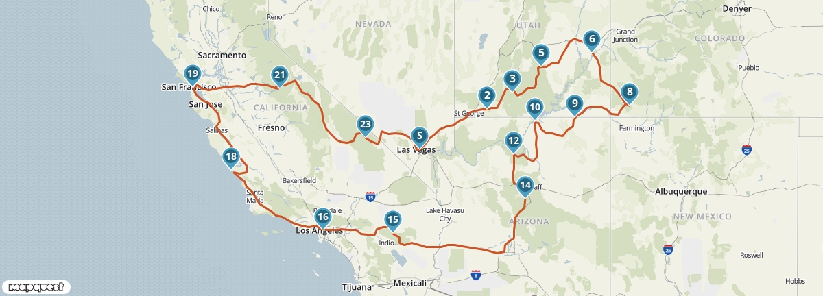 Vanuit Las Vegas maak je een rondreis langs de mooiste plaatsen van het zuidwesten van de Verenigde Staten. Je ziet de watervallen van Yosemite, de woestijnen van Nevada en Utah, de indianenreservaten van Arizona, Anasazi-nederzettingen in Colorado en de steden aan de Pacific Coast. Je verblijft op een aantal plaatsen twee nachten, dus je hebt voldoende tijd om alles goed te bekijken en te beleven.