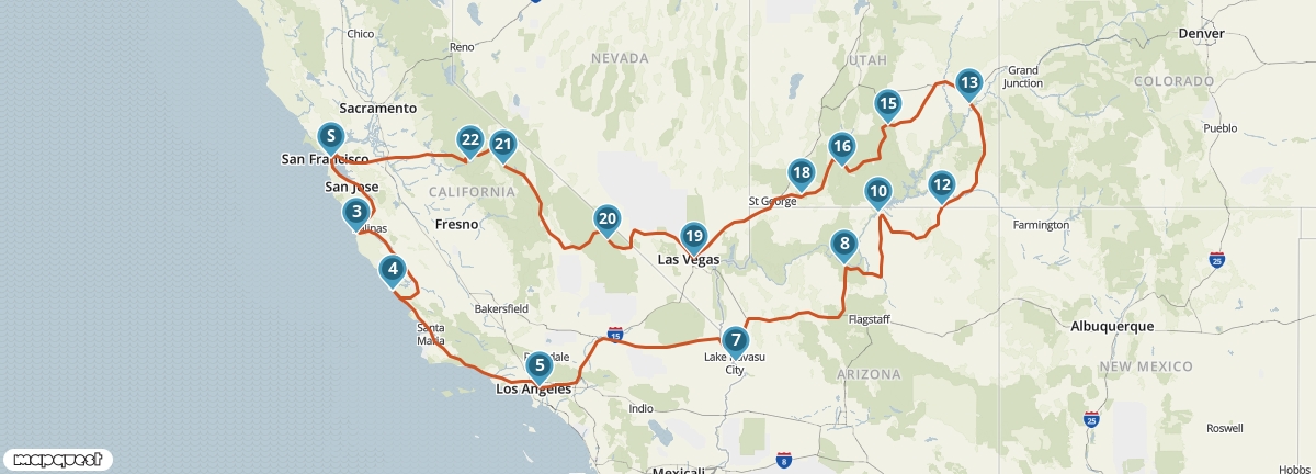 Tijdens deze reis krijg je een goede indruk van de hoogtepunten van het zuidwesten van de Verenigde Staten. Je bezoekt vier staten en ziet onderweg wereldsteden als San Francisco, Las Vegas en Los Angeles. Bovendien maak je kennis met verschillende National Parks, waaronder Yosemite en de Grand Canyon. Een van de mooiste etappes van de reis voert je over de beroemde Pacific Coast Highway.