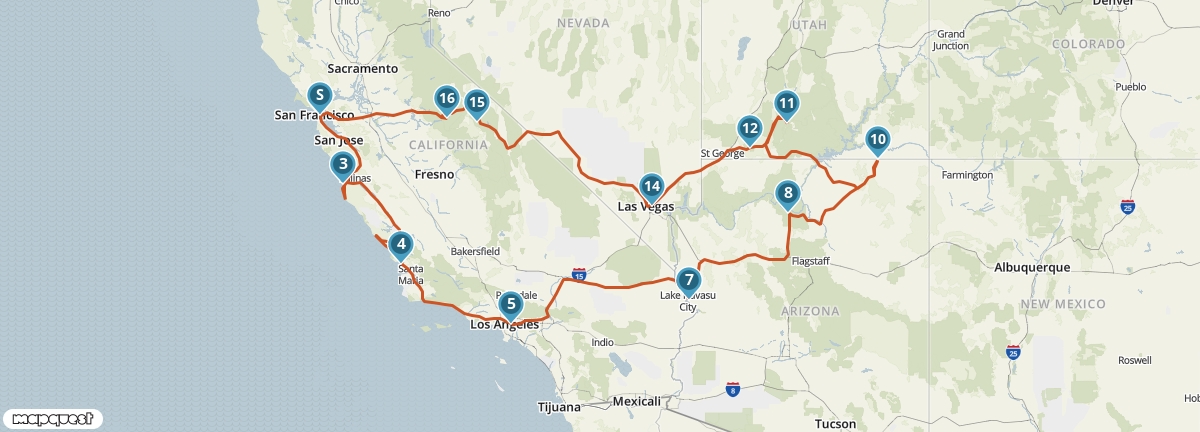 Vanuit San Francisco maak je een rondreis langs de mooiste plaatsen van het zuidwesten van de Verenigde Staten. Je ziet de watervallen van Yosemite, de woestijnen van Nevada en Utah, de indianenreservaten van Arizona en de steden aan de Pacific Coast. Je verblijft op een aantal plaatsen twee nachten, dus je hebt voldoende tijd om alles goed te bekijken en te beleven.