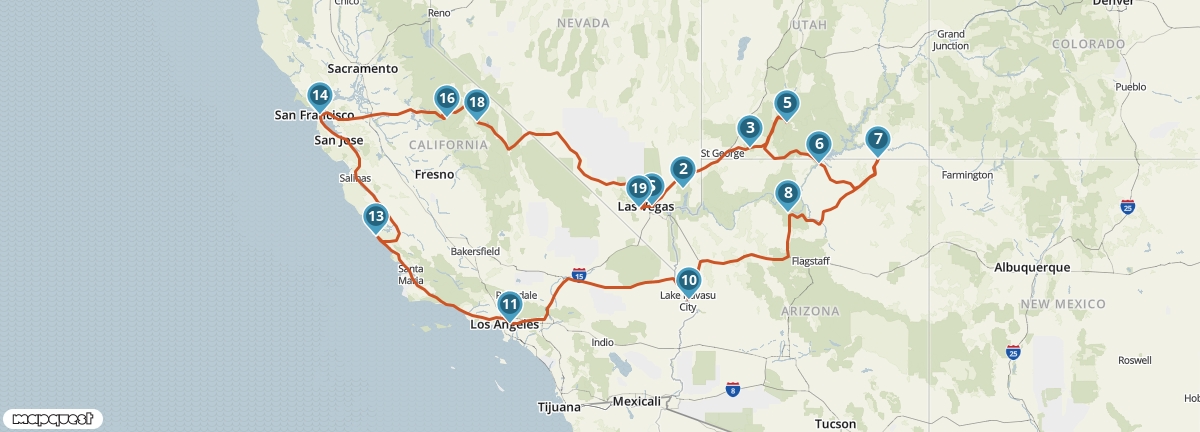 Vanuit Las Vegas maak je een rondreis langs de mooiste plaatsen van het zuidwesten van de Verenigde Staten. Je ziet de watervallen van Yosemite, de woestijnen van Nevada en Utah, de indianenreservaten van Arizona en de steden aan de Pacific Coast. Je verblijft op een aantal plaatsen twee nachten, dus je hebt voldoende tijd om alles goed te bekijken en te beleven.