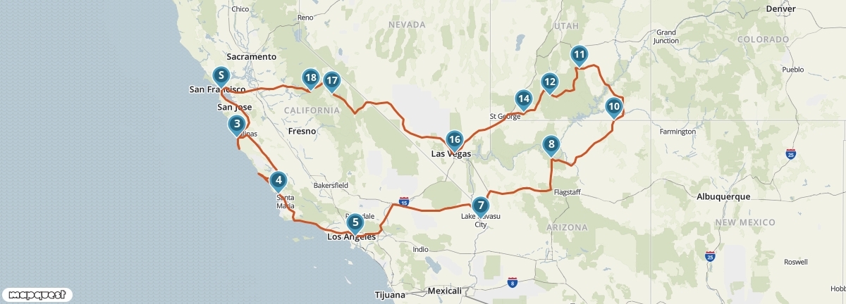 Vanuit San Francisco maak je een rondreis langs de mooiste plaatsen van het zuidwesten van de Verenigde Staten. Je ziet de watervallen van Yosemite, de woestijnen van Nevada en Utah, de indianenreservaten van Arizona en de steden aan de Pacific Coast. Je verblijft op een aantal plaatsen twee nachten, dus je hebt voldoende tijd om alles goed te bekijken en te beleven.