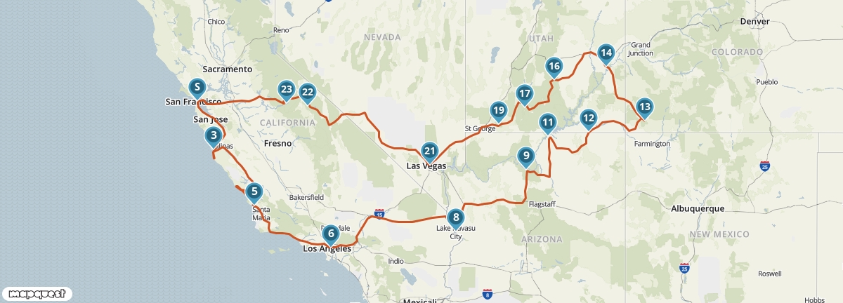 Vanuit San Francisco maak je een rondreis langs de mooiste plaatsen van het zuidwesten van de Verenigde Staten. Je ziet de watervallen van Yosemite, de woestijnen van Nevada en Utah, de indianenreservaten van Arizona, de Anasazi-nederzettingen in Colorado en de steden aan de Pacific Coast. Je verblijft op een aantal plaatsen twee nachten, dus je hebt voldoende tijd om alles goed te bekijken en te beleven.