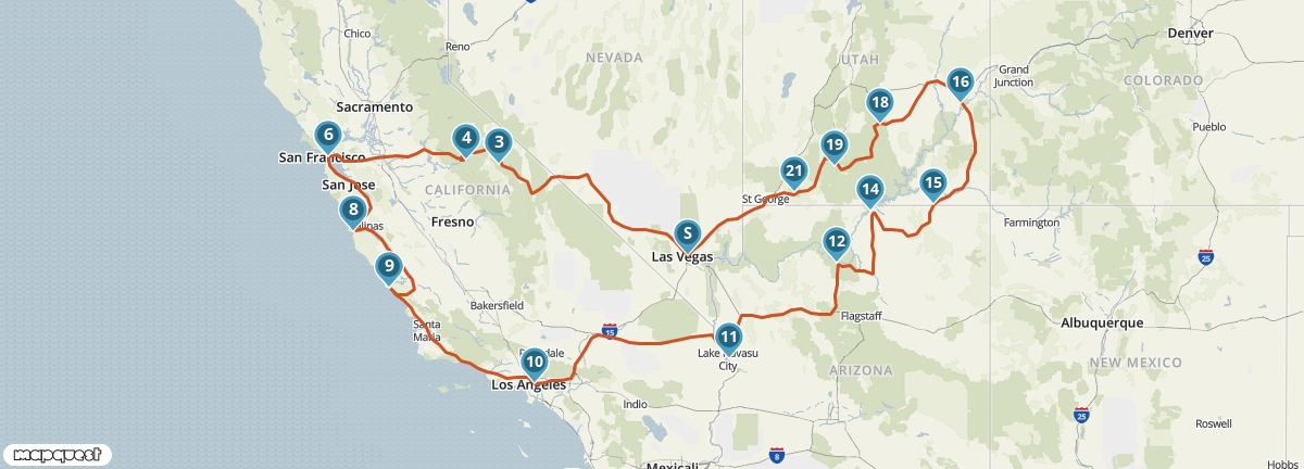 Tijdens deze reis krijg je een goede indruk van de hoogtepunten van het zuidwesten van de Verenigde Staten. Je bezoekt vier staten en ziet onderweg wereldsteden als San Francisco, Las Vegas en Los Angeles. Bovendien maak je kennis met verschillende National Parks, waaronder Yosemite en de Grand Canyon. Een van de mooiste etappes van de reis voert je over de beroemde Pacific Coast Highway.